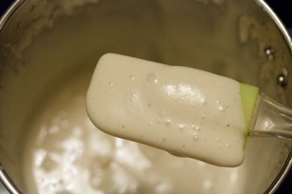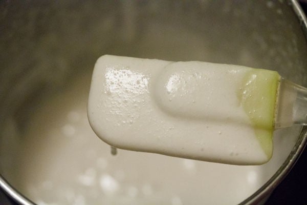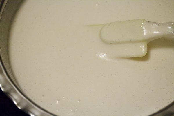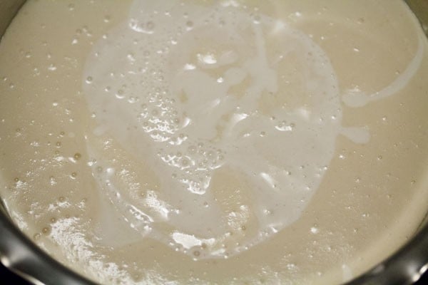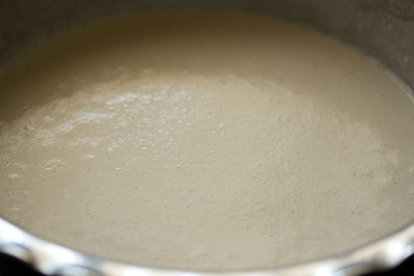 And grind the urad dal for some seconds. Then add ¼ cup of the reserved soaked water or fresh water and continue to grind. The batter should be light and fluffy when completely ground.