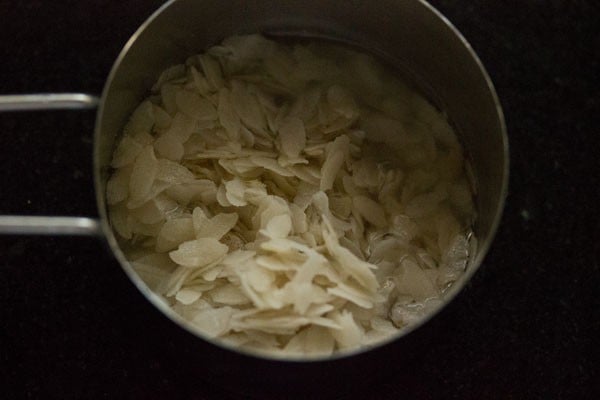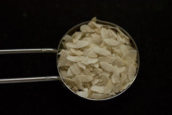 Take ¼ cup thick poha (flattened rice) in a bowl. Poha helps in making the idli soft and fluffy. If you don’t have poha, you can skip it.