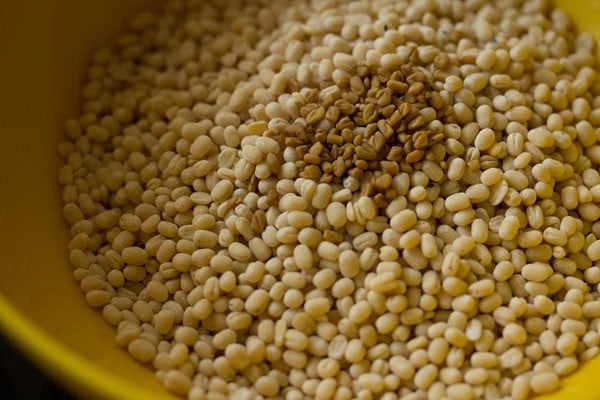 In a separate bowl, take ½ cup urad dal (husked black gram) along with ¼ teaspoon fenugreek seeds. Omit the fenugreek seeds if you don’t have them.